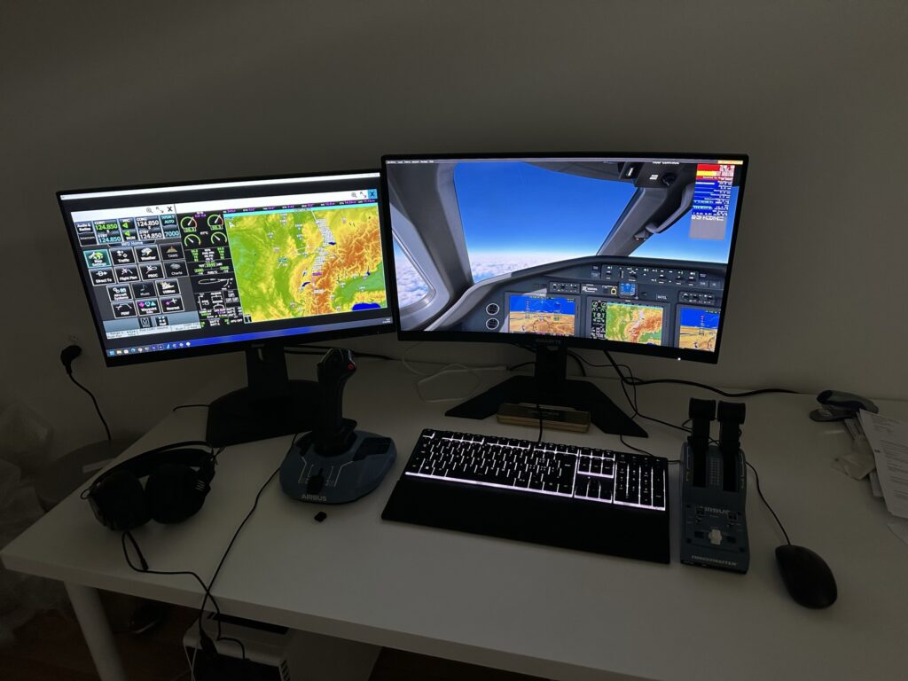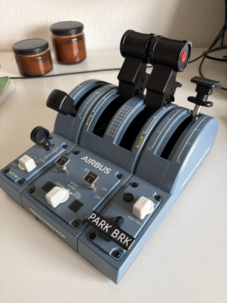Grâce à la sortie de MSFS 2020, la simulation s’est largement démocratisée. De nombreux éditeurs tentent de faire leur place et de sortir de nouveaux produits Hardware. Notamment Thrustmaster, très connus pour leurs joysticks, sortent un modèle Airbus, et annonce aussi une sortie imminente de la manette des gazs et un peu plus tard des compléments Spoilers/Flaps. On se rapproche à ce moment, tout doucement d’un véritable setup de cockpit.
